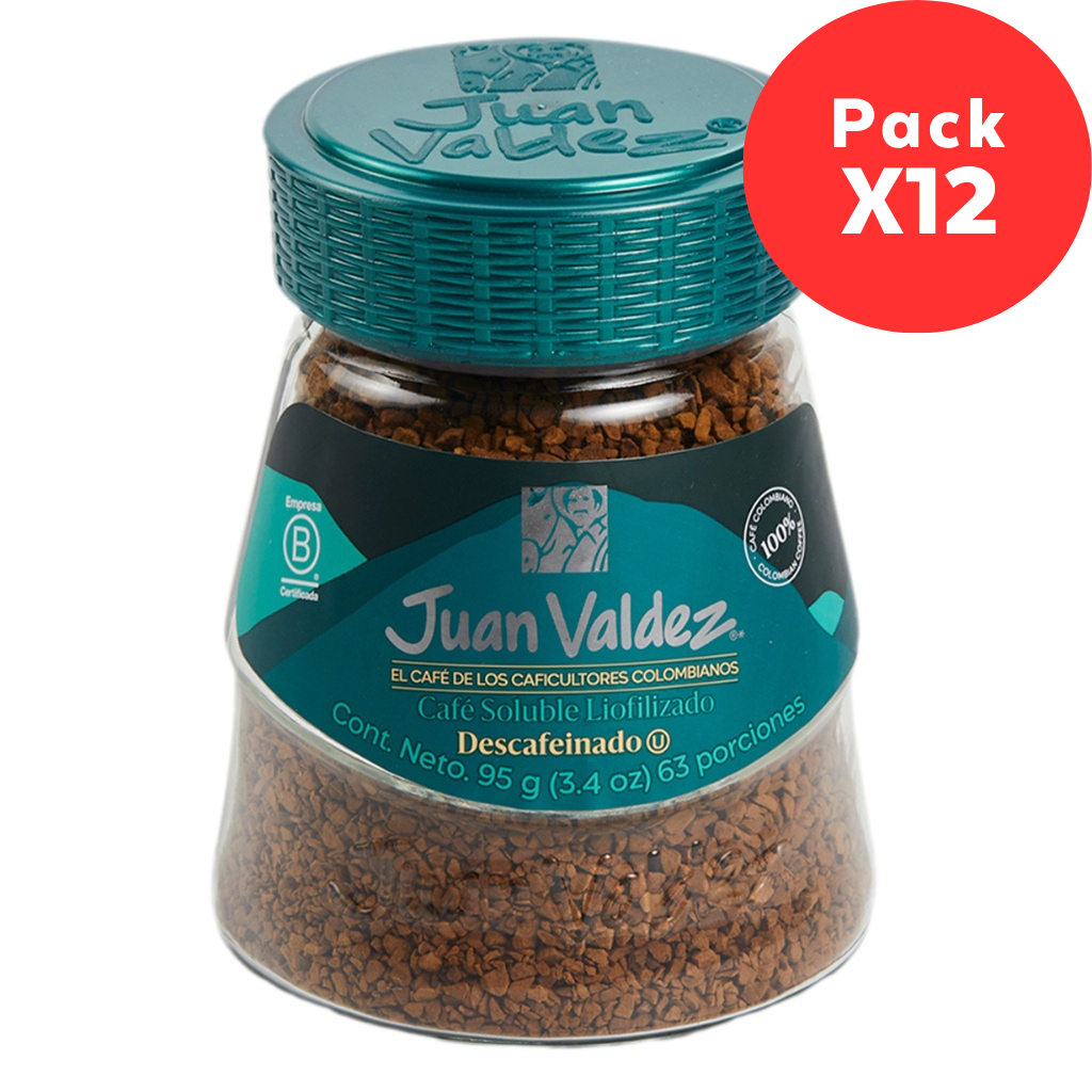 Con el auténtico sabor del café colombiano, este café soluble liofilizado descafeinado Juan Valdez ofrece una taza rica y aromática sin cafeína.